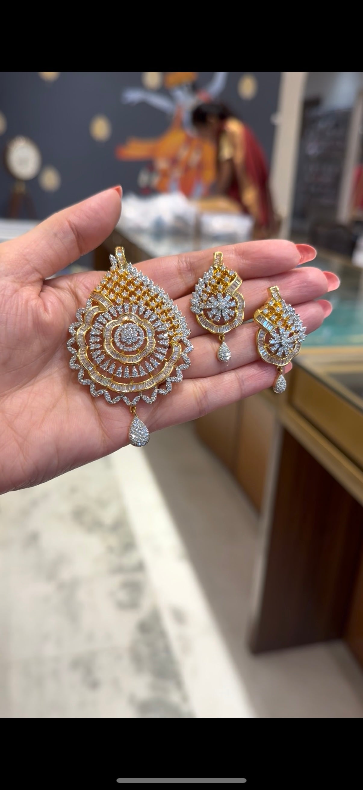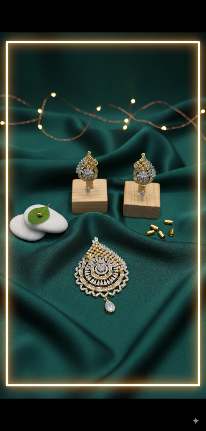 Add a touch of luxury to your outfit with these stunning 24kt. Gold Micron Plated Silver Alloy pendant set featuring diamond look alike stones and semi-precious colored stones, this pendant set with earrings will elevate your style.Â