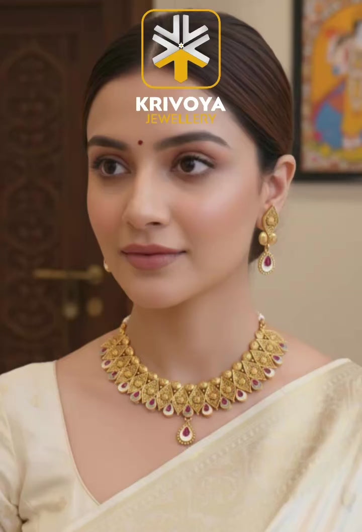 Elevate your look with this stunning 24kt. Gold Micron Plated Silver Alloy Necklace Set featuring Semi-precious coloured stones and imported enamel for a touch of glamour and elegance.Â