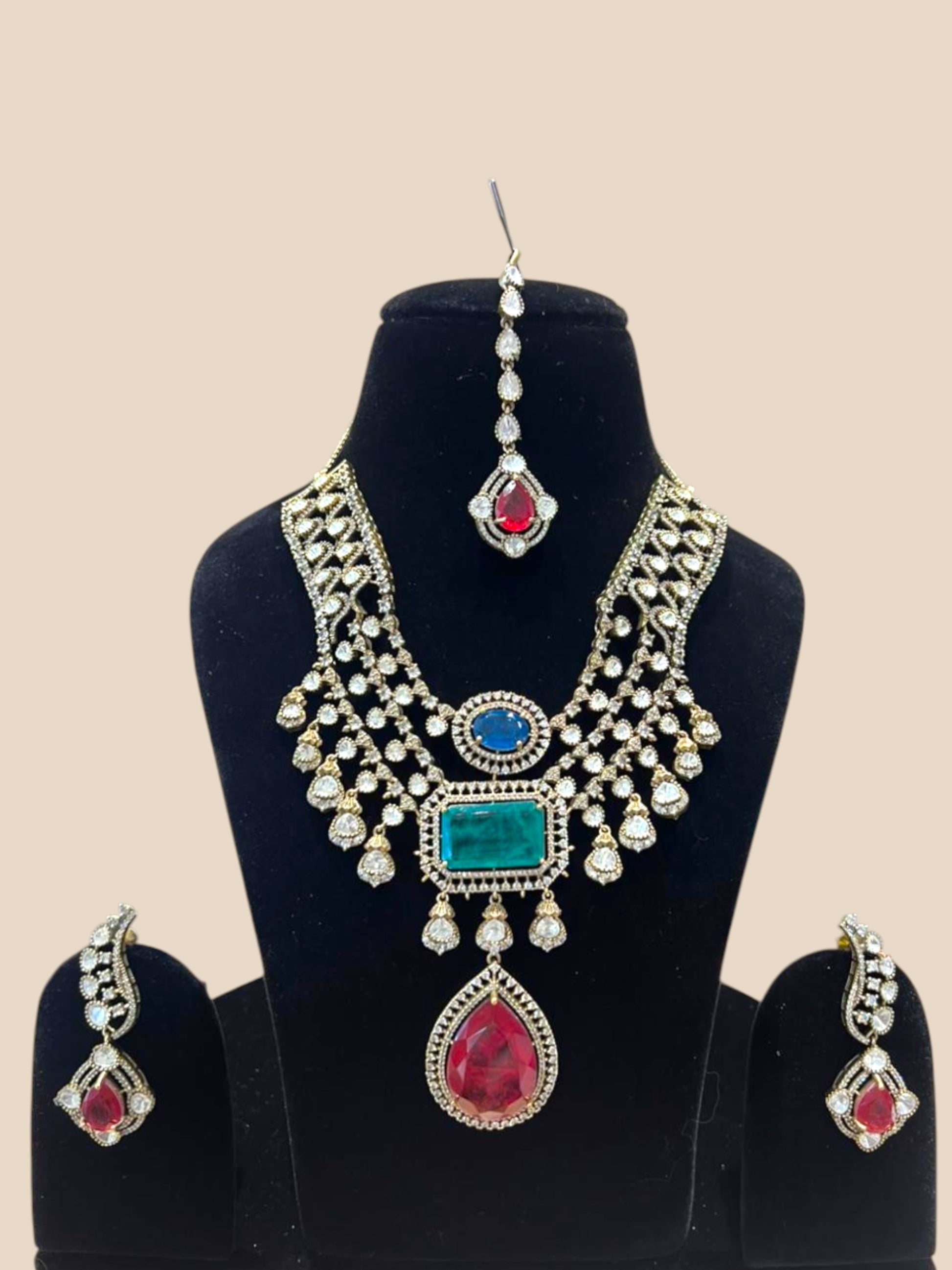 Embrace timeless elegance with the Anupama Necklace Set, a complete bridal ensemble featuring a stunning necklace paired with a traditional mangaltika. This exquisite collection showcases vibrant gemstones artfully arranged to create a mesmerizing play of color and light. The mangaltika adds an authentic touch of cultural significance, while the necklace complements it perfectly for weddings, festivals, and special celebrations. Each piece is meticulously crafted to blend traditional craftsmanship with contemporary design, ensuring you shine with grace and sophistication. A versatile investment that honors heritage while elevating your festive look.
