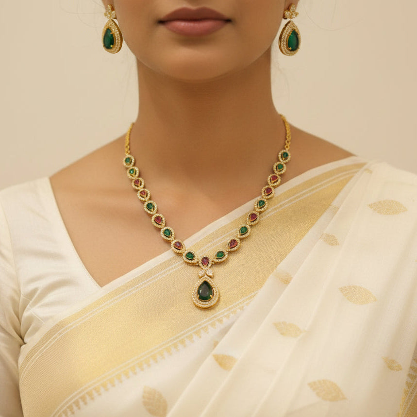 We select only the finest materials, including 24kt Gold Micron Plated Silver Alloy, adorned with imported Austrian cut Diamond look-alike stones, semi-precious colored stones, Kundan, and freshwater pearls. Each piece is carefully made to reflect our commitment to quality and style.