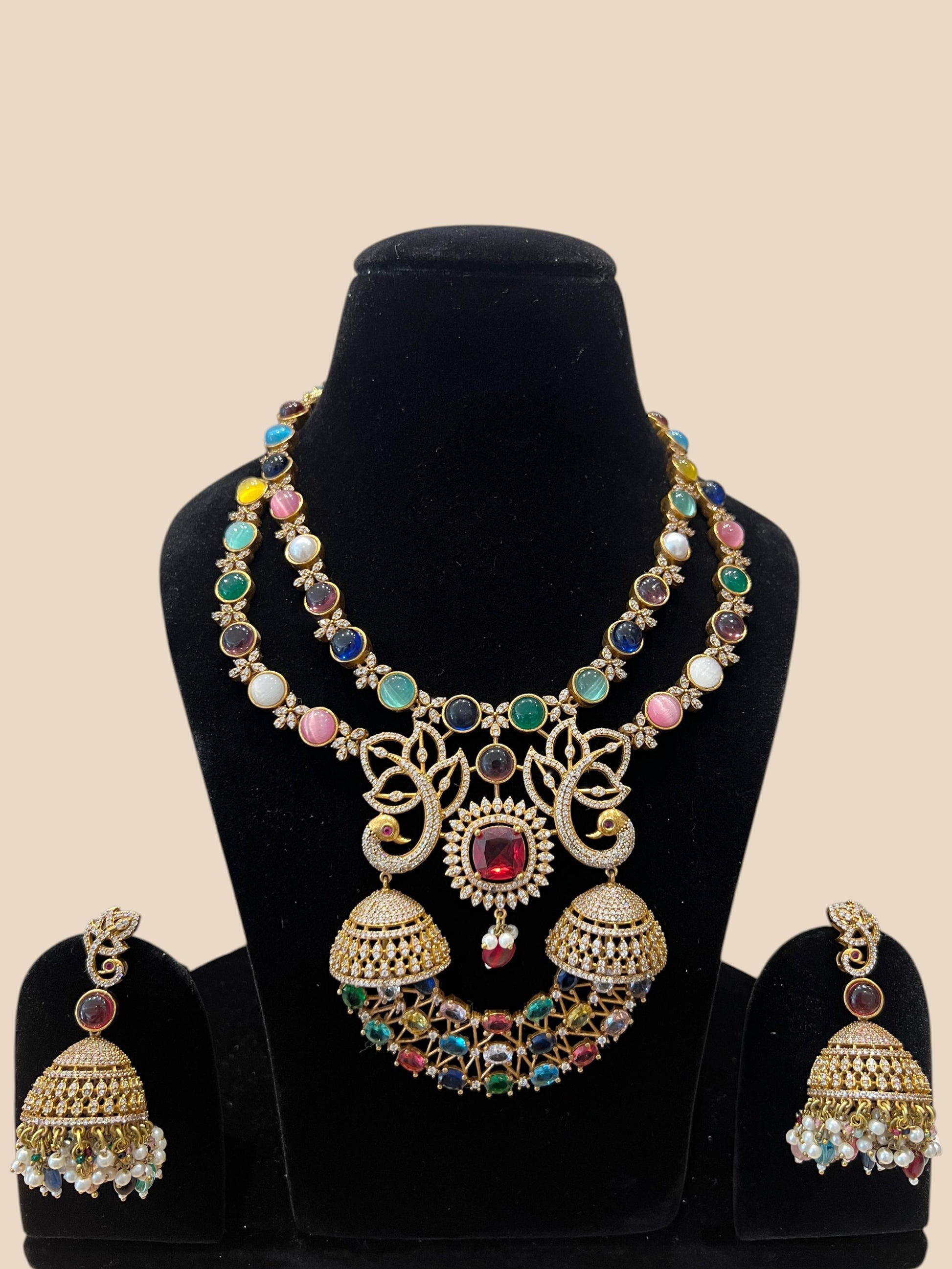 Elevate your elegance with the Anuraga Necklace Set, a stunning multi-stone collection designed to captivate. This exquisite set features an array of vibrant gemstones carefully arranged to create a harmonious blend of color and sparkle. Perfect for special occasions or adding a touch of sophistication to everyday wear, each piece radiates timeless beauty. The versatile design complements various outfits and skin tones, making it an essential addition to your jewelry collection. Crafted with attention to detail, this necklace set brings together tradition and contemporary style in one magnificent piece.