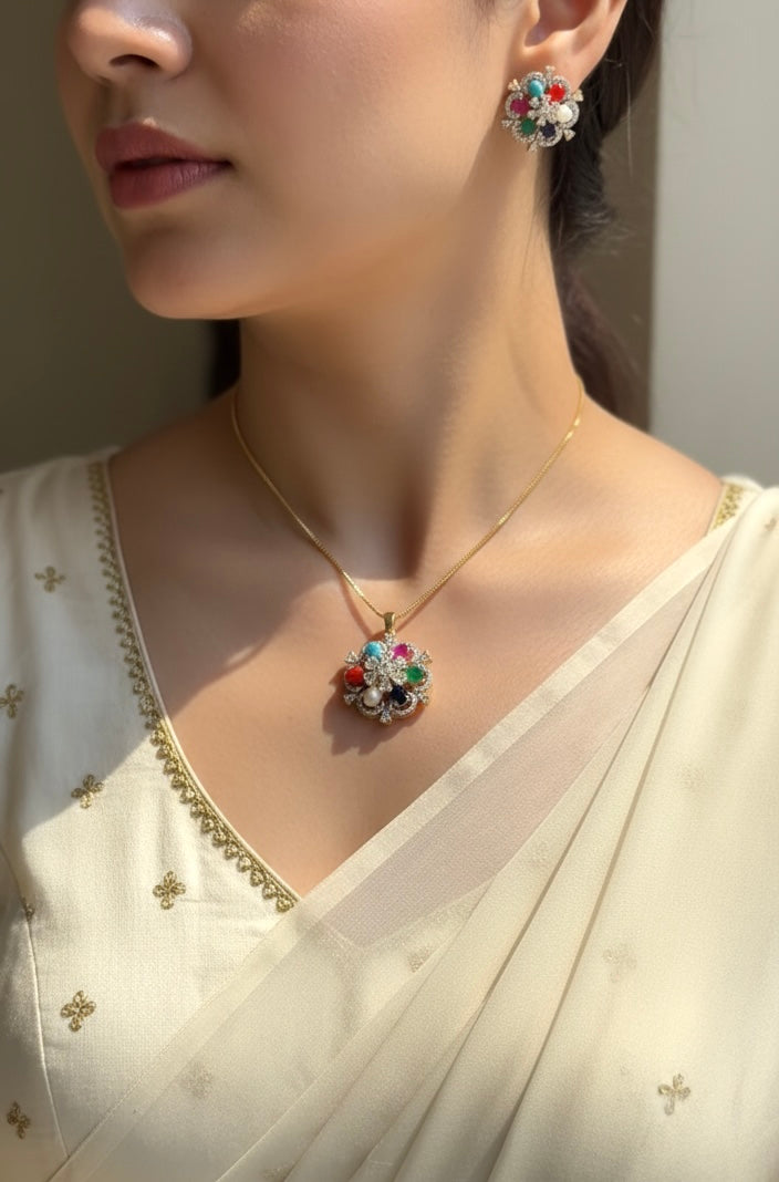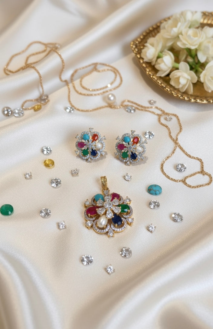 Add a touch of luxury to your outfit with these stunning 24kt. Gold Micron Plated Silver Alloy pendant set featuring diamond look alike stones and semi-precious colored stones, this pendant set with earrings will elevate your style.